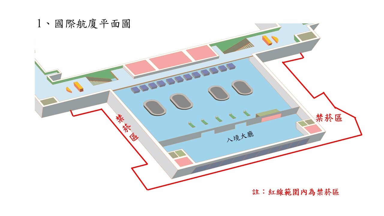 二、禁菸範圍:高雄機場國內線航廈及國際線航廈紅線範圍內區域(如附圖)。